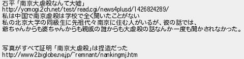 558: (大阪府) [sage] 2020/05/29(金) 17:26:55 ID:s/qhYfWa 石平 「南京大虐殺なんて大嘘」 http://yomogi.2ch.net/test/read.cgi/news4plusd/1426824289/ 私は中国で南京虐殺は学校で全く聞いたことがない 私の北京大学の同級生に先祖代々南京に住む人がいるが、彼の話では、 爺ちゃんからも婆ちゃんからも親戚の誰からも大虐殺の話なんか一度も聞かされなかった。 写真がすべて証明 「南京大虐殺」は捏造だった http://www2.biglobe.ne.jp/~remnant/nankingmj.htm http://egg.5ch.io/test/read.cgi/develop/1590063113/558