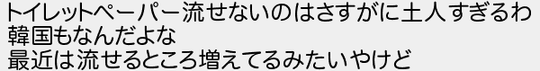 トイレットペーパー流せないのはさすがに土人すぎるわ 韓国もなんだよな 最近は流せるところ増えてるみたいやけど