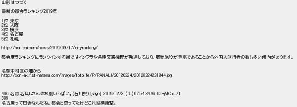 484: (神奈川県) [sage] 2020/06/15(月) 05:07:14.33 ID:4HmWQ5jI 山形はつづく 最新の都会ランキング2019年 1位 東京 2位 大阪 3位 横浜 4位 名古屋 5位 札幌 http://honichi.com/news/2019/09/17/cityranking/ 都会度ランキングにランクインする街ではインフラや各種交通機関が発達しており、商業施設が豊富であることから外国人旅行者の数も多い傾向があります。 名駅中村区の畑から http://cdn-ak.f.st-hatena.com/images/fotolife/P/PANALI/20120324/20120324231844.jpg 406 名前:名無しさん@お腹いっぱい。(石川県) [sage] :2019/12/21(土) 07:54:34.96 ID:+jMOxL/t 396 名古屋って田舎なんだね。都会と思ってたけどこれ結構衝撃。 http://egg.5ch.net/test/read.cgi/develop/1590699800/484