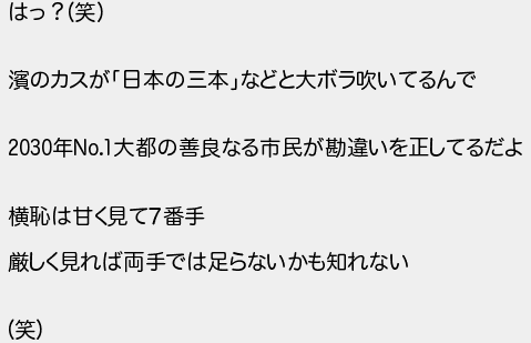 はっ?笑 のカスが日本の三本などと大ボラ吹いてるんで 年大都の善良なる市民が勘違いを正してるだよ 横恥は甘く見て7番手 厳しく見れば両手では足らないかも知れない 笑