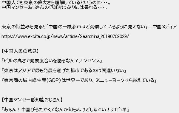 682: (東京都) [sage] 2020/06/22(月) 11:01:32.38 ID:oKNsbbFG 中国人でも東京の偉大さを理解しているというのに・・・。 中国マンセーおじさんの低知能っぷりには呆れる・・・。 東京の街並みを見ると「中国の一線都市ほど発展しているように見えない」=中国メディア https://www.excite.co.jp/news/article/Searchina_20190709029/ 【中国人民の意見】 『ビルの高さで発展度合いを語るなんてナンセンス』 『東京はアジアで最も発展を遂げた都市であるのは間違いない』 『東京圏の域内総生産(GDP)は世界一であり、米ニューヨークすら越えている』 【中国マンセー低知能おじさん】 『あぁん!中国びるたかくてなんか知らんけどしゅごい!シコピュ早』 http://egg.5ch.io/test/read.cgi/develop/1591153359/682