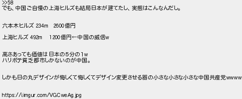 68: (東京都) [sage] 2020/06/04(木) 01:14:25.06 ID:nCGfYNbM >>58 でも、中国ご自慢の上海ヒルズも結局日本が建てたし、実態はこんなんだし。 六本木ヒルズ 234m 2600億円 上海ヒルズ 492m 1200億円←中国の威信w 高さあっても価値は日本の5分の1w ハリボテ貧乏都市しかないのが中国。 しかも日の丸デザインが悔しくて悔しくてデザイン変更させる器の小さな小さな小さな中国共産党wwww https://i.imgur.com/VGCweAg.jpg http://egg.5ch.io/test/read.cgi/develop/1591153359/68