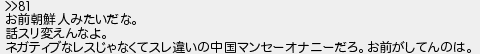 お前朝鮮人みたいだな 話スリ変えんなよ ネガティブなレスじゃなくてスレ違いの中国マンセーオナニーだろお前がしてんのは