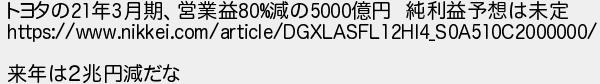 161: (大阪府) [] 2020/06/11(木) 08:49:03.70 ID:9Usk6bmY トヨタの21年3月期、営業益80%減の5000億円 純利益予想は未定 https://www.nikkei.com/article/DGXLASFL12HI4_S0A510C2000000/ 来年は2兆円減だな http://egg.5ch.net/test/read.cgi/develop/1591715357/161
