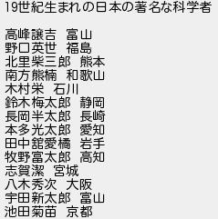 世紀生まれの日本の著名な科学者 高峰譲吉 富山 野口英世 福島 北里柴三郎 熊本 南方熊楠 和歌山 木村栄 石川 鈴木梅太郎 静岡 長岡半太郎 長崎 本多光太郎 愛知 田中舘愛橘 岩手 牧野富太郎 高知 志賀潔 宮城 八木秀次 大阪 宇田新太郎 富山 池田菊苗 京都