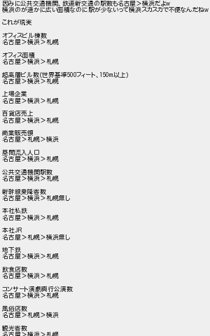 因みに公共交通機関鉄道新交通の駅数も名古屋横浜だよ 横浜のが遥かに広い面積なのに駅が少ないって横浜スカスカで不便なんだね これが現実 オフィスビル棟数 名古屋横浜札幌 オフィス面積 名古屋横浜札幌 超高層ビル数世界基準フィート以上 名古屋横浜札幌 上場企業 名古屋横浜札幌 百貨店売上 名古屋横浜札幌 商業販売額 名古屋札幌横浜 昼間流入人口 名古屋横浜札幌 公共交通機関駅数 名古屋横浜札幌 新幹線乗降客数 名古屋横浜札幌無し 本社私鉄 名古屋横浜札幌 本社 名古屋札幌横浜無し 地下鉄 名古屋横浜札幌 飲食店数 名古屋横浜札幌 コンサート演劇興行公演数 名古屋横浜札幌 風俗店数 名古屋札幌横浜 観光客数 名古屋横浜札幌