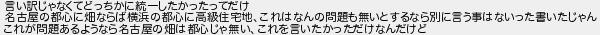 言い訳じゃなくてどっちかに統一したかったってだけ 名古屋の都心に畑ならば横浜の都心に高級住宅地これはなんの問題も無いとするなら別に言う事はないった書いたじゃん これが問題あるようなら名古屋の畑は都心じゃ無いこれを言いたかっただけなんだけど