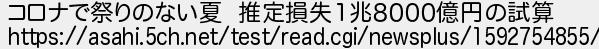 55: (東京都) [sage] 2020/06/22(月) 14:15:45.69 ID:jU1U6Uri コロナで祭りのない夏 推定損失1兆8000億円の試算 https://asahi.5ch.net/test/read.cgi/newsplus/1592754855/ http://egg.5ch.io/test/read.cgi/develop/1592695047/55