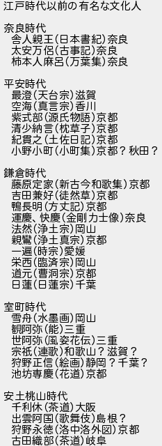 江戸時代以前の有名な文化人 奈良時代 舎人親王日本書紀奈良 太安万侶古事記奈良 柿本人麻呂万葉集奈良 平安時代 最澄天台宗滋賀 空海真言宗香川 紫式部源氏物語京都 清少納言枕草子京都 紀貫之土佐日記京都 小野小町小町集京都?秋田? 鎌倉時代 藤原定家新古今和歌集京都 吉田兼好徒然草京都 鴨長明方丈記京都 運慶快慶金剛力士像奈良 法然浄土宗岡山 親浄土真宗京都 一遍時宗愛媛 栄西臨済宗岡山 道元曹洞宗京都 日蓮日蓮宗千葉 室町時代 雪舟水墨画岡山 観阿弥能三重 世阿弥風姿花伝三重 宗祇連歌和歌山?滋賀? 狩野正信絵画静岡?千葉? 池坊専慶花道京都 安土桃山時代 千利休茶道大阪 出雲阿国歌舞伎島根? 狩野永徳洛中洛外図京都 古田織部茶道岐阜