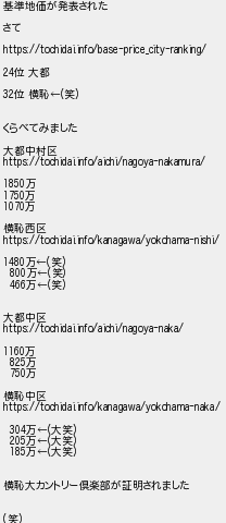 192: (SB-Android) [sage] 2020/10/02(金) 17:13:10.94 ID:dzzrMmKb 基準地価が発表された さて https://tochidai.info/base-price_city-ranking/ 24位 大都 32位 横恥←(笑) くらべてみました 大都中村区 https://tochidai.info/aichi/nagoya-nakamura/ 1850万 1750万 1070万 横恥西区 https://tochidai.info/kanagawa/yokohama-nishi/ 1480万←(笑) 800万←(笑) 466万←(笑) 大都中区 https://tochidai.info/aichi/nagoya-naka/ 1160万 825万 750万 横恥中区 https://tochidai.info/kanagawa/yokohama-naka/ 304万←(大笑) 205万←(大笑) 185万←(大笑) 横恥大カントリー倶楽部が証明されました (笑) http://egg.5ch.net/test/read.cgi/develop/1592812877/192
