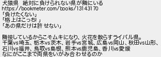 348: (東京都) [sage] 2020/06/29(月) 07:51:19 ID:FOcPhPcP 犬猿県 絶対に負けられない県が隣にいる https://bookmeter.com/books/13143170 「負けたくない」 「格上はこっち! 」 「あの県だけは許せない」 隣接しているからこそムキになり、火花を散らすライバル県。 千葉vs埼玉、栃木vs茨木、岩手vs宮城、広島vs岡山、秋田vs山形、 石川vs福井、鳥取vs島根、熊本vs鹿児島、香川vs愛媛 なにがここまで両県をいがみ合わせるのか http://egg.5ch.io/test/read.cgi/develop/1593140608/348