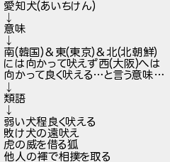 愛知犬あいちけん 意味 南韓国東東京北北朝鮮 には向かって吠えず西大阪へは 向かって良く吠えると言う意味 類語 弱い犬程良く吠える 敗け犬の遠吠え 虎の威を借る狐 他人ので相撲を取る