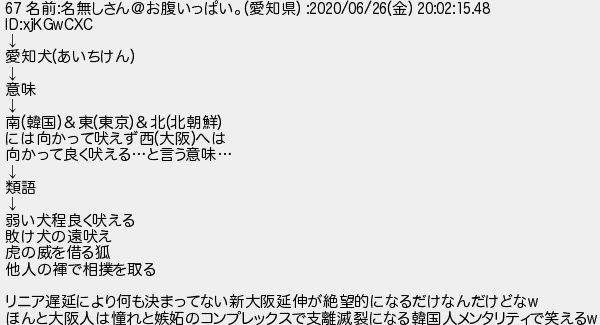 名前名無しさんお腹いっぱい愛知県 金 愛知犬あいちけん 意味 南韓国東東京北北朝鮮 には向かって吠えず西大阪へは 向かって良く吠えると言う意味 類語 弱い犬程良く吠える 敗け犬の遠吠え 虎の威を借る狐 他人ので相撲を取る リニア遅延により何も決まってない新大阪延伸が絶望的になるだけなんだけどな ほんと大阪人は憧れと嫉妬のコンプレックスで支離滅裂になる韓国人メンタリティで笑える
