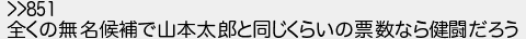 855: (茸) [] 2020/07/07(火) 18:09:27 ID:zollf1a8 >>851 全くの無名候補で山本太郎と同じくらいの票数なら健闘だろう http://egg.5ch.io/test/read.cgi/develop/1593140608/855