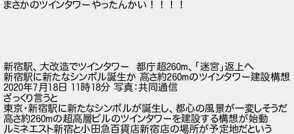 672: (東京都) [sage] 2020/07/18(土) 15:19:07.01 ID:qLARo+AH まさかのツインタワーやったんかい!!!! 新宿駅、大改造でツインタワー 都庁超260m、「迷宮」返上へ 新宿駅に新たなシンボル誕生か 高さ約260mのツインタワー建設構想 2020年7月18日 11時18分 写真:共同通信 ざっくり言うと 東京・新宿駅に新たなシンボルが誕生し、都心の風景が一変しそうだ 高さ約260mの超高層ビルのツインタワーを建設する構想が始動 ルミネエスト新宿と小田急百貨店新宿店の場所が予定地だという http://egg.5ch.io/test/read.cgi/develop/1593762965/672