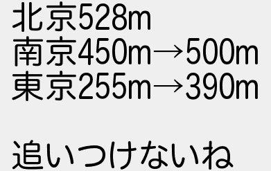84: (愛知県) [] 2020/08/25(火) 12:15:22.07 ID:pp8xRmiL 北京528m 南京450m→500m 東京255m→390m 追いつけないね http://egg.5ch.io/test/read.cgi/develop/1593937374/84