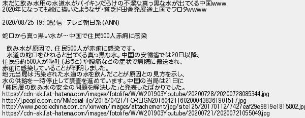 862: (東京都) [] 2021/01/25(月) 07:24:31.29 ID:lKCUzfXs 未だに飲み水用の水道水がバイキンだらけの不潔な真っ黒な水が出てくる中国www 2020年になっても絵に描いたようなザ・貧乏ド田舎発展途上国でワロタwwww 2020/08/25 19:10配信 テレビ朝日系(ANN) 蛇口から真っ黒い水が…中国で住民500人赤痢に感染 飲み水が原因で、住民500人が赤痢に感染です。 水道の蛇口をひねると出てくる真っ黒な水。中国の安徽省では20日以降、 住民ら約500人が嘔吐(おうと)や腹痛などの症状で病院に搬送され、 赤痢に感染していることが判明しました。 地元当局は汚染された水道の水を飲んだことが原因との見方を示し、 水の供給を一時停止して調査を進めています。中国の当局は21日に 「貧困層の飲み水の安全の問題を解決した」と発表したばかりでした。 https://cdn-ak.f.st-hatena.com/images/fotolife/W/W201903Youtube/20200728/20200728085344.jpg http://j.people.com.cn/NMediaFile/2016/0421/FOREIGN201604211602000438361901517.jpg http://www.peoplechina.com.cn/xinwen/images/attachement/jpg/site125/20170112/7427eaf29e9819e1815802.jpg https://cdn-ak.f.st-hatena.com/images/fotolife/W/W201903Youtube/20200721/20200721055049.jpg http://egg.5ch.io/test/read.cgi/develop/1593937374/862