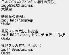 8: (茸) [sage] 2020/07/05(日) 18:47:20.99 ID:I4AiIrsc 日本のヨハネストンキン連呼の荒らし zaq3d2ea321.zaq.ne.jp 大阪府 鉄道板の荒らし zaq31fa1c77.zaq.ne.jp Osaka 最弱スレの荒らし朴虎吉 zaq31fb60f2.zaq.ne.jpトラキチ ◆fEJJu0jwjE Osaka 進路スレの荒らしPLおやじ zaq77189ea3.zaq.ne.jp Osaka http://egg.5ch.io/test/read.cgi/develop/1593937374/8