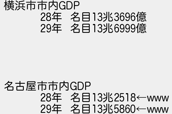 142: (庭) [] 2020/07/27(月) 01:12:09.53 ID:IXNIYGD/ 横浜市市内GDP 28年 名目13兆3696億 29年 名目13兆6999億 名古屋市市内GDP 28年 名目13兆2518←www 29年 名目13兆5860←www http://egg.5ch.io/test/read.cgi/develop/1595586978/142