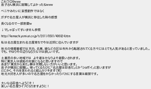 62: (神奈川県) [] 2020/07/25(土) 07:41:49.52 ID:xpQDTapi これワロタwww 息子さん横浜に就職してよかったねwww ベニヤみたいに妄想創作ではなく ガチで名古屋人が横浜に移住した時の感想 長くなるので一部割愛w ↓でしゃばってすいません参照 http://komachi.yomiuri.co.jp/t/2011/0501/406024.htm 私は名古屋生まれ名古屋育ちで今は近郊に住んでいますが 地元の情報番組では天白、名東、緑などの区は市外から転居されてくる方々にはとても人気があると言っていました。 でも、やはりその辺りならクルマは欲しいです。 土着民の多い地域では よそ者はかなりよそ者扱いされます。 特に東京人は嫉妬の対象になると思いますので あまり「東京から来た」事は吹聴しない方がいいと思います。 息子が横浜に就職し、帰ってくるたびに「名古屋は田舎だ」とか「ショボイ」と言いますが とにかく、それを言われると超ムカツキます(笑) 地元大好き人が多いので名古屋をからかったりバカにする言葉は厳禁です。 大いなる田舎へようこそ! 楽しい名古屋ライフとなりますように! http://egg.5ch.io/test/read.cgi/develop/1595586978/62