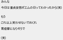 みんな 今日は童貞妄想ポエムの日ってわかったから笑 もう これ以上笑わせないでおくれ 胃になりそうで 笑