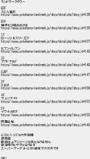 583: (Unknown) [] 2023/11/07(火) 19:26:50.91 ID:oRDj8Nx6 ランドマークタワー B2F うどん宮武 https://www.yokohama-landmark.jp/shop/detail.php?shop_id=5389 B1F 博多もつ鍋おおやま https://www.yokohama-landmark.jp/shop/detail.php?shop_id=5387 1F ローソン&スリーエフ https://www.yokohama-landmark.jp/shop/detail.php?shop_id=5579 セブンイレブン https://www.yokohama-landmark.jp/shop/detail.php?shop_id=5432 2F マクドナルド https://www.yokohama-landmark.jp/shop/detail.php?shop_id=5492 GAP https://www.yokohama-landmark.jp/shop/detail.php?shop_id=5477 3F H&M https://www.yokohama-landmark.jp/shop/detail.php?shop_id=5506 4F サムソナイト https://www.yokohama-landmark.jp/shop/detail.php?shop_id=5537 5F イワキメガネ https://www.yokohama-landmark.jp/shop/detail.php?shop_id=5553 阿里山城 https://www.yokohama-landmark.jp/shop/detail.php?shop_id=5404 どこに入っても大衆風情 庶民道 服装は上下ジャージも気になりません 部活帰りもサマになります スーパーマーケットに行く感覚で大丈夫です (笑) http://egg.5ch.io/test/read.cgi/develop/1596519425/583