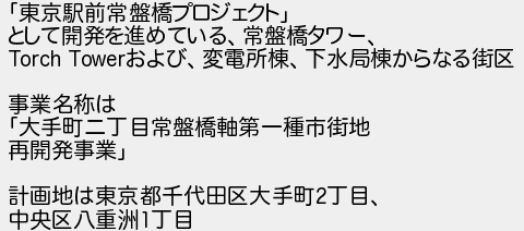 東京駅前常盤橋プロジェクト として開発を進めている常盤橋タワー および変電所棟下水局棟からなる街区 事業名称は 大手町二丁目常盤橋軸第一種市街地 再開発事業 計画地は東京都千代田区大手町丁目 中央区八重洲丁目