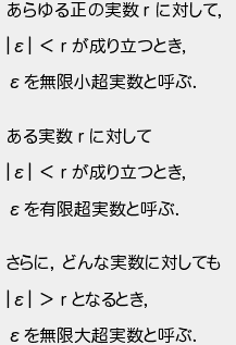 あらゆる正の実数 に対して が成り立つとき を無限小超実数と呼ぶ ある実数 に対して が成り立つとき を有限超実数と呼ぶ さらにどんな実数に対しても となるとき を無限大超実数と呼ぶ