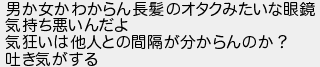 男か女かわからん長髪のオタクみたいな眼鏡 気持ち悪いんだよ 気狂いは他人との間隔が分からんのか? 吐き気がする