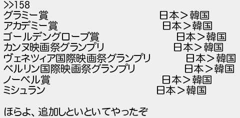 164: (やわらか銀行) [sage] 2020/08/20(木) 20:48:58.07 ID:HAtwpmGB >>158 グラミー賞 日本>韓国 アカデミー賞 日本>韓国 ゴールデングローブ賞 日本>韓国 カンヌ映画祭グランプリ 日本>韓国 ヴェネツィア国際映画祭グランプリ 日本>韓国 ベルリン国際映画祭グランプリ 日本>韓国 ノーベル賞 日本>韓国 ミシュラン 日本>韓国 ほらよ、追加しといといてやったぞ http://egg.5ch.io/test/read.cgi/develop/1597382011/164