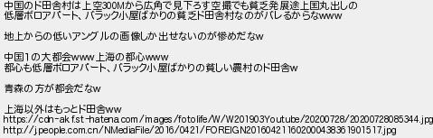 196: (埼玉県) [] 2020/08/21(金) 07:33:21.67 ID:Tq6mRGNp 中国のド田舎村は上空300Mから広角で見下ろす空撮でも貧乏発展途上国丸出しの 低層ボロアパート、バラック小屋ばかりの貧乏ド田舎村なのがバレるからなwww 地上からの低いアングルの画像しか出せないのが惨めだなw 中国1の大都会www上海の都心www 都心も低層ボロアパート、バラック小屋ばかりの貧しい農村のド田舎w 青森の方が都会だなw 上海以外はもっとド田舎ww https://cdn-ak.f.st-hatena.com/images/fotolife/W/W201903Youtube/20200728/20200728085344.jpg http://j.people.com.cn/NMediaFile/2016/0421/FOREIGN201604211602000438361901517.jpg http://egg.5ch.io/test/read.cgi/develop/1597382011/196