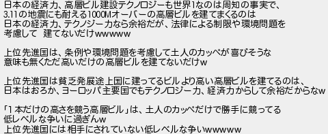 371: (埼玉県) [] 2020/08/27(木) 10:16:14.80 ID:F2QqBXDw 日本の経済力、高層ビル建設テクノロジーも世界1なのは周知の事実で、 3.11の地震にも耐える1000Mオーバーの高層ビルを建てまくるのは 日本の経済力、テクノジー力なら余裕だが、法律による制限や環境問題を 考慮して 建てないだけwwwww 上位先進国は、条例や環境問題を考慮して土人のカッペが喜びそうな 意味も無くただ高いだけの高層ビルを建てないだけw 上位先進国は貧乏発展途上国に建ってるビルより高い高層ビルを建てるのは、 日本はおろか、ヨーロッパ主要国でもテクノロジー力、経済力からして余裕だからなw 「1本だけの高さを競う高層ビル」は、土人のカッペだけで勝手に競ってる 低レベルな争いに過ぎんw 上位先進国には相手にされていない低レベルな争いwwwww http://egg.5ch.io/test/read.cgi/develop/1597382011/371