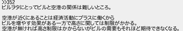 396: (東京都) [sage] 2020/08/27(木) 13:33:27.77 ID:0yXQRHzt >>352 ビルヲタにとってビルと空港の関係は難しいところ。 空港が近くにあることは経済活動にプラスに働くから ビルを増やす効果がある一方で高さに関しては制限がかかる。 空港が無ければ高さ制限はかからないがビルの需要もそれほど期待できなくなる。 http://egg.5ch.io/test/read.cgi/develop/1597382011/396