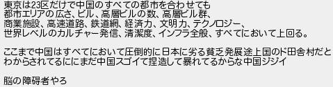 東京は区だけで中国のすべての都市を合わせても 都市エリアの広さビル高層ビルの数高層ビル群 商業施設高速道路鉄道網経済力文明力テクノロジー 世界レベルのカルチャー発信清潔度インフラ全般すべてにおいて上回る ここまで中国はすべてにおいて圧倒的に日本に劣る貧乏発展途上国のド田舎村だと わからされてるににまだ中国スゴイて造して暴れてるからな中国ジジイ 脳の障碍者やろ