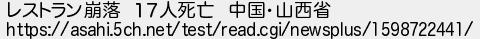 495: (沖縄県) [sage] 2020/08/30(日) 07:59:20.58 ID:ps80NdLP レストラン崩落 17人死亡 中国・山西省 https://asahi.5ch.net/test/read.cgi/newsplus/1598722441/ http://egg.5ch.io/test/read.cgi/develop/1597382011/495