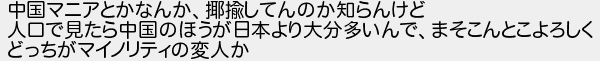 中国マニアとかなんかしてんのか知らんけど 人口で見たら中国のほうが日本より大分多いんでまそこんとこよろしく どっちがマイノリティの変人か