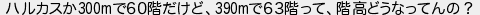 651: (大阪府) [sage] 2020/09/12(土) 10:10:18.01 ID:QyJL20yC ハルカスか300mで60階だけど、390mで63階って、階高どうなってんの? http://egg.5ch.io/test/read.cgi/develop/1597382011/651