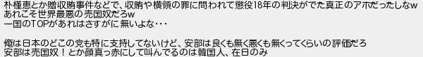 朴恵とか贈収賄事件などで収賄や横領の罪に問われて懲役年の判決がでた真正のアホだったしな あれこそ世界最悪の売国奴だろ 一国のがあれはさすがに無いよな 俺は日本のどこの党も特に支持してないけど安部は良くも無く悪くも無くってくらいの評価だろ 安部は売国奴!とか顔真っ赤にして叫んでるのは韓国人在日のみ
