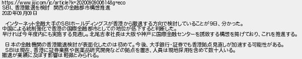 970: (兵庫県) [] 2020/09/10(木) 00:28:38 ID:Soi9UeHj https://www.jiji.com/jc/article?k=2020090900614&g=eco SBI、香港撤退を検討 関西の金融都市構想推進 2020年09月09日 インターネット金融大手のSBIホールディングスが香港から撤退する方向で検討していることが9日、分かった。 中国による統制強化で香港の国際金融都市としての地位が低下すると判断した。 早ければ今年度内にも実施する見通し。北尾吉孝社長は大阪や神戸に国際金融センターを誘致する構想を掲げており、これを推進する。 日本の金融機関の香港撤退検討が表面化したのは初めて。今後、大手銀行・証券でも香港拠点見直しが加速する可能性がある。 SBIは現在、香港に証券業務や医薬品研究開発などの拠点を置き、人員は現地採用を含めて数十人いる。 撤退が業績に及ぼす影響は軽微とみられる。 http://egg.5ch.io/test/read.cgi/develop/1598327255/970