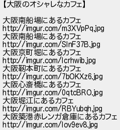 39: (光) [] 2020/09/22(火) 17:27:02 ID:yW7v+rsh 【大阪のオシャレなカフェ】 大阪南船場にあるカフェ http://imgur.com/m3XVpPq.jpg 大阪南船場にあるカフェ http://imgur.com/SlnF37B.jpg 大阪京町堀にあるカフェ http://imgur.com/Icrhwib.jpg 大阪靭本町にあるカフェ http://imgur.com/7bOKXz6.jpg 大阪心斎橋にあるカフェ http://imgur.com/0qtcBRO.jpg 大阪堀江にあるカフェ http://imgur.com/RBYubqh.jpg 大阪築港赤レンガ倉庫にあるカフェ http://imgur.com/Iov9ev8.jpg http://egg.5ch.io/test/read.cgi/develop/1600762206/39