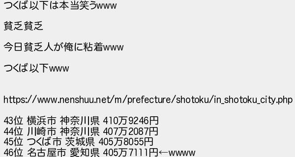 つくば以下は本当笑う 貧乏貧乏 今日貧乏人が俺に粘着 つくば以下 位 横浜市 神奈川県 万円 位 川崎市 神奈川県 万円 位 つくば市 茨城県 万円 位 名古屋市 愛知県 万円