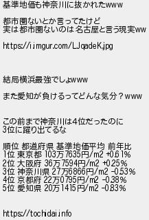 基準地価も神奈川に抜かれた 都市圏ないとか言ってたけど 実は都市圏ないのは名古屋と言う現実 結局横浜最強でしょ また愛知が負けるってどんな気分? この前まで神奈川は4位だったのに 位に躍り出てるな 順位 都道府県 基準地価平均 前年比 位 東京都 万円 位 大阪府 万円 位 神奈川県 万円 位 京都府 万円 位 愛知県 万円