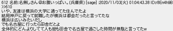 657: (東京都) [] 2020/11/03(火) 08:05:42.71 ID:u8S2gFMu 612 名前:名無しさん@お腹いっぱい。(兵庫県) [sage] :2020/11/03(火) 01:04:43.38 ID:r8En4h9B >>610 いや、友達は横浜の大学に通ってた住んでたよ 結局神戸に戻って就職したが横浜は都会だったと言ってたな 横浜は広いみたいだし でも名古屋に行ったら田舎だとよ 全体的にどんよりしてて人も街も田舎で名古屋で過ごした時間が無駄と言ってたw http://egg.5ch.io/test/read.cgi/develop/1603358636/657