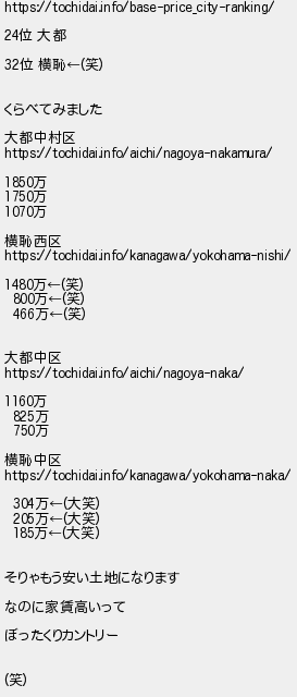 位 大都 位 横恥笑 くらべてみました 大都中村区 万 万 万 横恥西区 万笑 万笑 万笑 大都中区 万 万 万 横恥中区 万大笑 万大笑 万大笑 そりゃもう安い土地になります なのに家賃高いって ぼったくりカントリー 笑