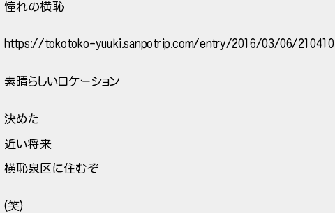320: (SB-Android) [sage] 2020/12/08(火) 21:38:25 ID:RODfcT0W 憧れの横恥 https://tokotoko-yuuki.sanpotrip.com/entry/2016/03/06/210410 素晴らしいロケーション 決めた 近い将来 横恥泉区に住むぞ (笑) http://egg.5ch.io/test/read.cgi/develop/1604566514/320