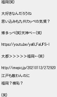 福岡笑 大好きなんだろうね 思い込みも九州カッペの気質? 博多っぺ笑天神べー笑 大都福岡笑 江戸も敵わんのに 福岡?横恥? 笑