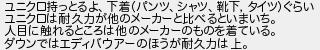 ユニクロ持っとるよ下着パンツシャツ靴下タイツぐらい ユニクロは耐久力が他のメーカーと比べるといまいち 人目に触れるところは他のメーカーのものを着ている ダウンではエディバウアーのほうが耐久力は上