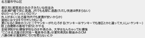 653: (愛知県) [] 2020/12/13(日) 02:30:26 ID:yqO1705x 名古屋市守山区 春日井と尾張旭の合の子みたいな街並み 名鉄瀬戸線で栄に直通、JRでも名駅に直通(ただし快速は停まらない) ゆとりーとラインというロマン 外人が多い(名古屋市内でも家賃が安いからか) 奥地にはタヌキやカモシカもいる 夏になると深夜のコンビニでヤンキーがたむろする(ヤンキーはヤンキーでも港区とかと違って大人しいヤンキー) 陸上自衛隊の基地で祭りとかやる 金城学院がお嬢様学校なのは中高のみ、大学はなんちゃってお嬢様 「ここは名古屋の別天地〜竜泉寺の湯」は愛知県民お馴染みのCM 八勝の味は蓬莱軒に引けを取らないとか http://egg.5ch.net/test/read.cgi/develop/1604791485/653