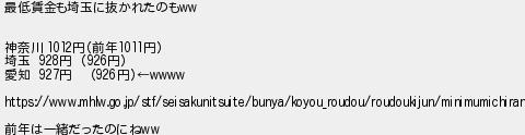 最低賃金も埼玉に抜かれたのも 神奈川 円前年円 埼玉 円 円 愛知 円 円 前年は一緒だったのにね