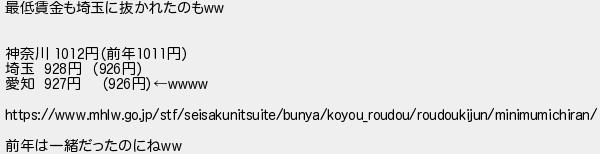 最低賃金も埼玉に抜かれたのも 神奈川 円前年円 埼玉 円 円 愛知 円 円 前年は一緒だったのにね